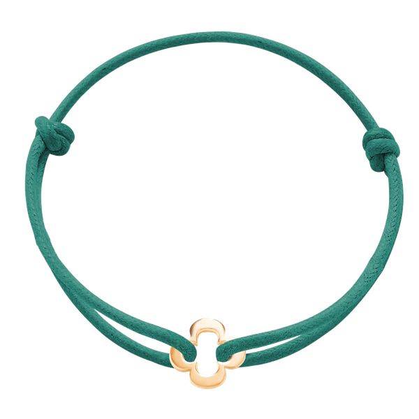 Bransoletka z pozłacaną ażurową koniczyną o wielkości 1 cm na grubym sznurku w kolorze morskiej zieleni. Koniczyna jest symbolem szczęścia i pomyślności. Zawieszka pozłacana 18-karatowym złotem.
