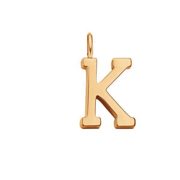 Literka K o wielkości 1 cm. Zawieszka została wykonana ze stali szlachetnej pokrytej 18-karatowym złotem.