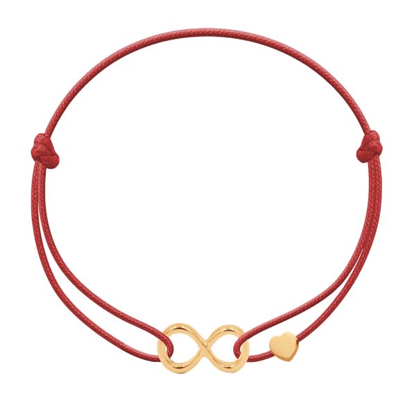 Bransoletka Stella z pozłacaną nieskończonością o wielkości 1 cm i pozłacanym sercem Etincelle o wielkości 0,6 cm na cienkim czerwonym bawełnianym sznurku. Nieskończoność jest symbolem trwałości i wieczności. Serce jest symbolem miłości i namiętności. Elementy pozłacane 18-karatowym złotem.