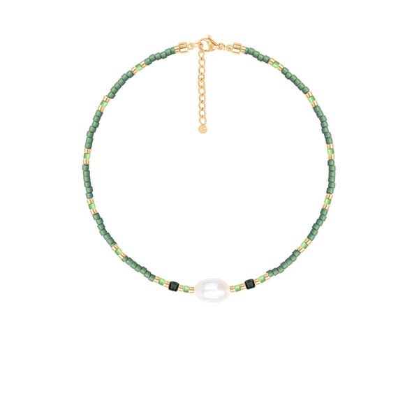 Bransoletka wykonana z japońskich koralików szklanych Miyuki w kolorze zielonym i złotym i turkusu syntetycznego z 3 białymi perłami. Turkus zwany jest kamieniem siły i zwycięstwa. Długość bransoletki: 16 cm + 5 cm przedłużki (kamienie montowane są na elastycznej żyłce) Zapięcie wykonane ze stali szlachetnej pokrytej 18-karatowym złotem. Perły słodkowodne hodowane.