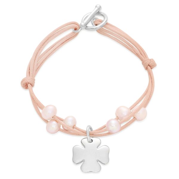 Bransoletka ze srebrnym zapięciem, srebrną koniczyną o wielkości 1,5 cm i 6 małymi różowymi perłami na cienkim, potrójnym pudroworóżowym sznurku. Osobisty grawerunek doda wyjątkowości i pomoże wyrazić uczucia. Koniczyna jest symbolem szczęścia i pomyślności. Waga:Zawieszka koniczyna: 2,5 gram.Zapięcie: 1,8 gram.