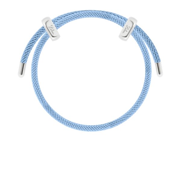 Bransoletka Liana, posrebrzana w kolorze jasnoniebieskim z możliwością regulacji. Całkowita długość bransoletki: 25 cm Zapięcie do regulowania ze stali szlachetnej pokrytej srebrem próby 925. Bransoletka wykonana z terylenu. Bransoletkę możesz spersonalizować dodając do niej swój ulubiony talizman Lilou.