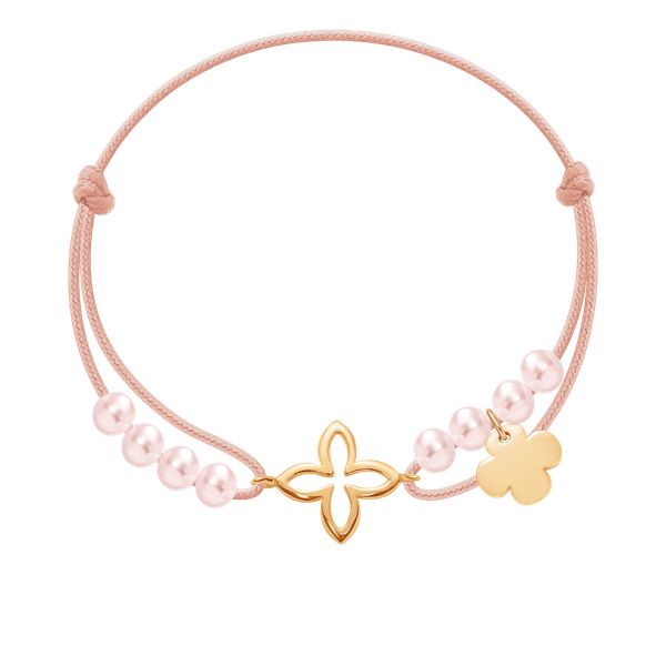 Bransoletka na sznurku Lilianne Bransoletka wykonana jest z bawełnianego sznurka w kolorze pudrowego różu. Bransoletkę zdobią elementy: lilia pozłacana 18-karatowym złotem, okrągła koniczyna o wilekości 1 cm oraz różowe mini perełki. Z tyłu pozłacanej zawieszki widnieje logo Lilou. Bransoletka Lilianne jest regulowana. Użyte perły są naturalne, słodkowodne, charakteryzują się nieregularnym kształtem i niepowtarzalnością.