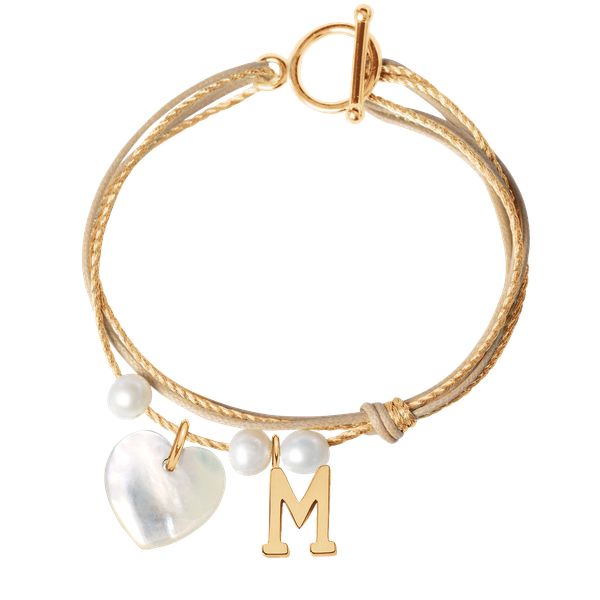 Bransoletka Royal z pozłacanym zapięciem w kształcie koła, pozłacaną literką M o wielkości 1 cm i pozłacanym sercem z masy perłowej o wielkości 1,5 cm i 3 małymi białymi perłami na sznurku grubym złotym premium i cienkim beżowym. Serce jest symbolem miłości, namiętnościi troski. Osobisty grawerunek uczyni Twoją biżuterię niepowtarzalną. Średnica perły: ok. 0,6 cm […]