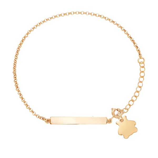 Bransoletka z blaszką i pozłacanym misiem o wielkości 1 cm. Osobisty grawerunek doda wyjątkowości i pomoże wyrazić uczucia. Miś jest symbolem troski i przyjaźni. Zawieszka i bransoletka pozłacane 18-karatowym złotem. Kółeczka umożliwiają regulację obwodu biżuterii. Obwód minimalny 16 cmObwód maksymalny 19 cm