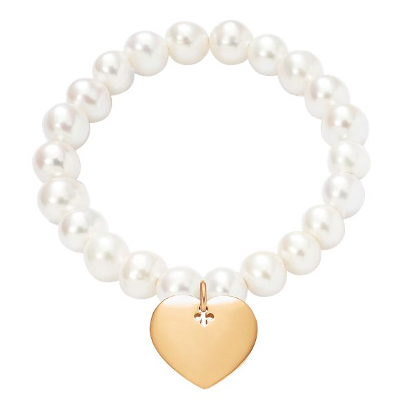 Bransoletka z pozłacanym sercem o wielkości 2 cm na dużych białych perłach. Osobisty grawerunek doda wyjątkowości i pomoże wyrazić uczucia. Serce jest symbolem miłości, namiętności i troski. Średnica koralika: ok. 0,8 cm Zawieszka pozłacana 18-karatowym złotem. Użyte perły są naturalne, słodkowodne, charakteryzują się nieregularnym kształtem i niepowtarzalnością.