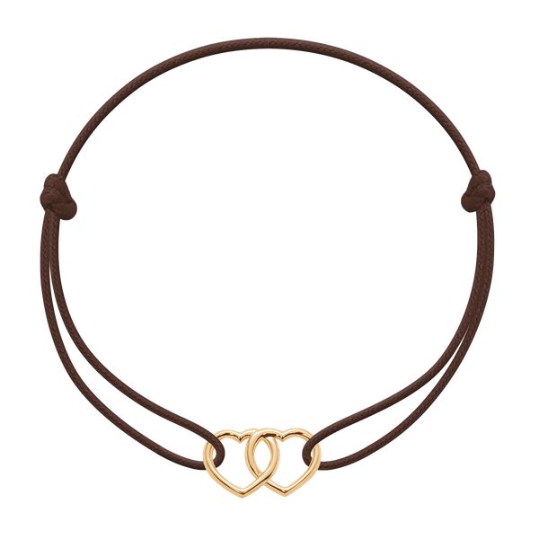 Bransoletka z pozłacanymi złączonymi sercami o wielkości 1 cm na cienkim czekoladowym sznurku. Złączone serca są symbolem trwałych uczuć. Element pozłacany 18-karatowym złotem.