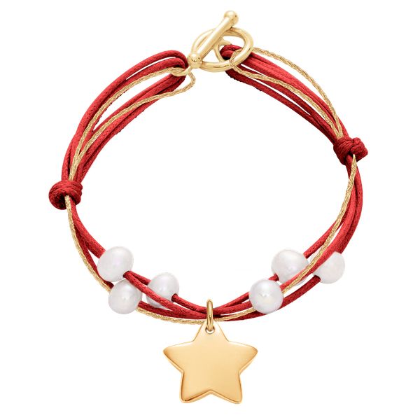 Bransoletka z pozłacaną gwiazdką o wielkości 1,5 cm, zapięciem w kształcie koła i 6 małymi białymi perłami na cienkim czerwonym sznurku i cienkim złotym sznurku premium. Gwiazdka jest symbolem szczęścia, sukcesu i doskonałości. Osobisty grawerunek uczyni Twoją biżuterię niepowtarzalną. Zawieszka i zapięcie pozłacane 18-karatowym złotem. Użyte perły są naturalne, słodkowodne, charakteryzują się nieregularnym kształtem i […]