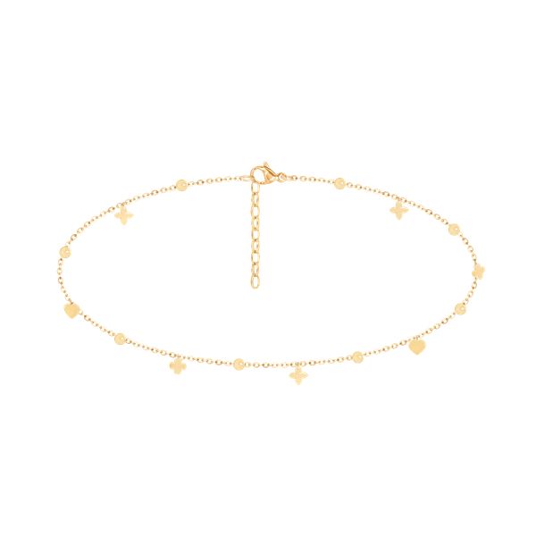 Bransoletka Etincelle to talizman stworzony z unikatowych i kultowych symboli marki – serca, koniczyny i lilii. Są one źródłem energii i spełnienia. To epicentrum pozytywnych emocji! Długość bransoletki: 23 cm + 5 cm przedłużki Wielkość elementów: 0,6 cmIlość elementów: 7 Bransoletka wykonana jest ze stali szlachetnej pokrytej 18-karatowym złotem.