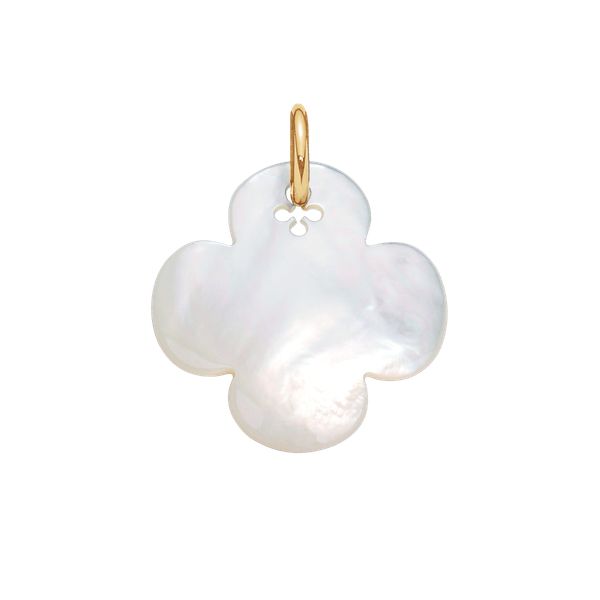 Koniczyna okrągła z masy perłowej o wielkości 2 cm pozłacana. Koniczyna jest symbolem szczęścia i pomyślności. Osobisty grawerunek uczyni Twoją biżuterię niepowtarzalną. Zawieszka została wykonana z masy perłowej, dlatego jej faktura może odbiegać od prezentowanej na zdjęciu. Kółeczko od zawieszki pozłacane 18-karatowym złotem.