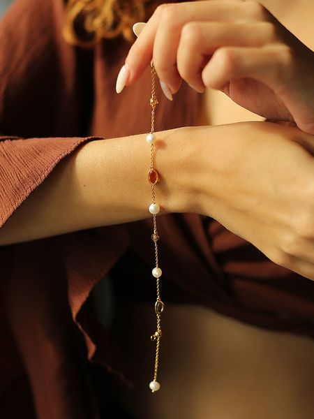 – materiał: mosiądz- powłoka: złoto- zapięcie: karabińczyk- rodzaj perły: hodowlana – słodkowodna- kolor perły: biały- rodzaj kamienia: cyrkonia- kolor kamienia: pomarańczowy- regulacja długości: takWskazówka: Zdjęcie produktu w powiększeniu.