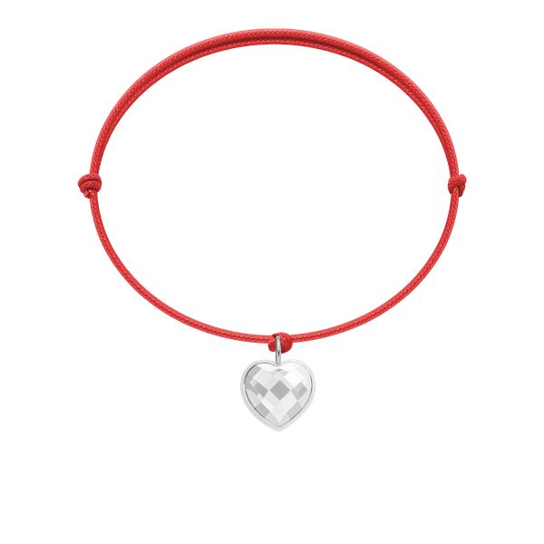 Bransoletka z zawieszką w kształcie serca z białym kryształem na cienkim, czerwonym, bawełnianym sznurku. Osobisty grawerunek uczyni Twoją biżuterię niepowtarzalną. Wielkość zawieszki: 1 cm Zawieszka wykonana ze stali szlachetnej pokrytej srebrem próby 925.