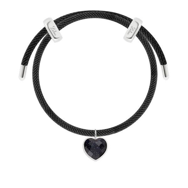 Bransoletka z zawieszką w kształcie serca z czarnym brokatowym szkłem kryształowym na Lianie w kolorze czarnym. Bransoletka ma możliwość regulacji. Osobisty grawerunek uczyni Twoją biżuterię niepowtarzalną. Wielkość zawieszki: 1 cm Całkowita długość bransoletki: 25 cm Zawieszka i zapięcie w bransoletce wykonane są ze stali szlachetnej pokrytej srebrem próby 925. Bransoletka wykonana z terylenu.