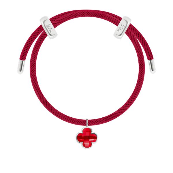 Bransoletka z zawieszką w kształcie koniczyny z czerwonym szkłem kryształowym na Lianie w kolorze ciemnoczerwonym. Bransoletka ma możliwość regulacji. Osobisty grawerunek uczyni Twoją biżuterię niepowtarzalną. Wielkość zawieszki: 1 cm Całkowita długość bransoletki: 25 cm Zawieszka i zapięcie w bransoletce wykonane są ze stali szlachetnej pokrytej srebrem próby 925. Bransoletka wykonana z terylenu.