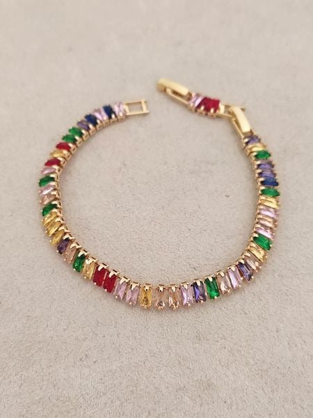 – materiał: mosiądz- zapięcie: składane- powłoka: w kolorze złota- rodzaj kamienia: cyrkonia- kolor kamienia: wielokolorowyWskazówka: Zdjęcie produktu w powiększeniu.