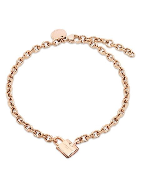 – materiał: stal szlachetna- powłoka: IP-roségold- typ łańcuszka: ankier- zapięcie: karabińczyk- element ozdobny: kłódka- regulacja długości: takWskazówka: Zdjęcie produktu w powiększeniu.