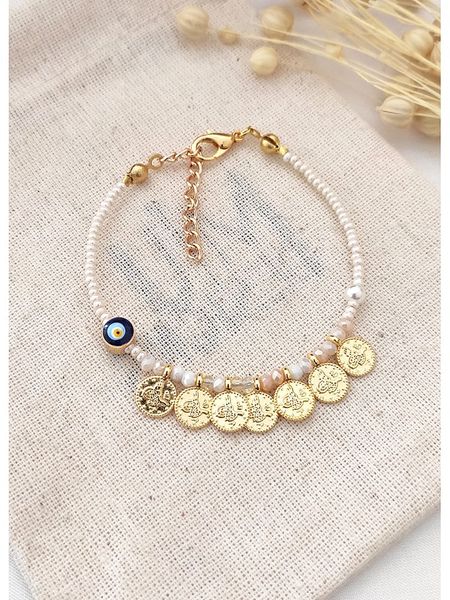 – materiał: mosiądz- powłoka: 14K złoto- zapięcie: karabińczyk- rodzaj perły: Miyuki – kolor kamienia: beżowy- element ozdobny: koło- regulacja długości: takWskazówka: Zdjęcie produktu w powiększeniu.