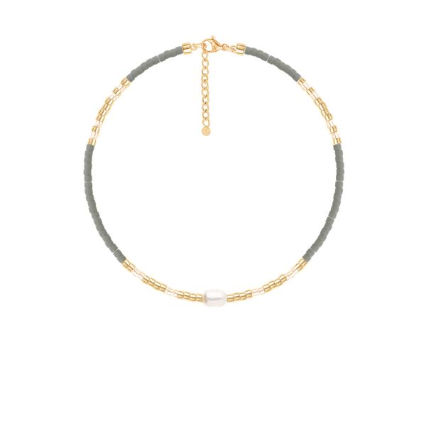 Brasnoletka wykonana z japońskich koralików szklanych Miyuki w kolorze szarym z białą perłą. Długość bransoletki: 16 cm + 5 cm przedłużki (koraliki montowane na elastycznej żyłce) Zapięcie wykonane jest ze stali szlachetnej pokrytej 18-karatowym złotem. Perła słodkowodna hodowana.