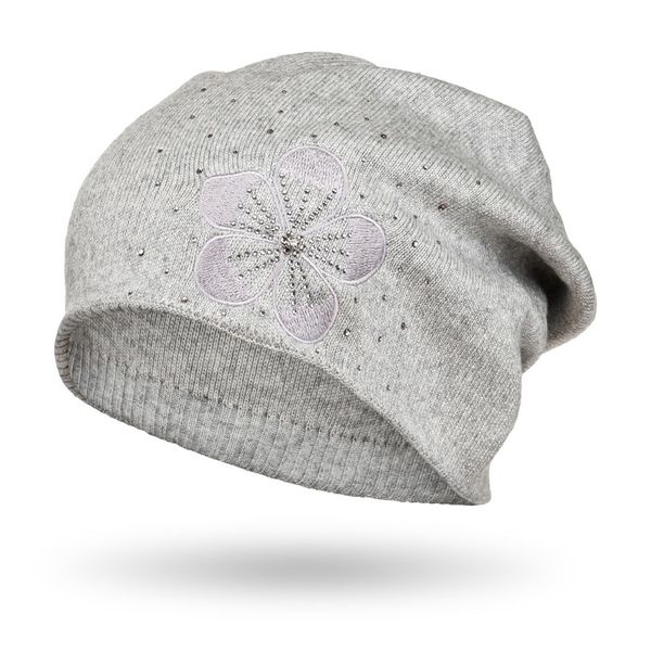 Elegancka czapka damska Peterson w kolorze szarym, wykonana z ciepłej dzianiny idealnej na chłodne dni. Uroku dodaje haftowany kwiat ozdobiony błyszczącymi kryształkami. Klasyczny fason beanie zapewnia wygodę i styl.