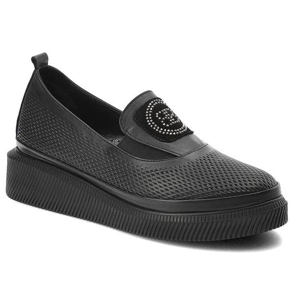 Czarne półbuty RAVINI – 375.0154 Czarny 001 T Syhevr to cieszący się popularnością fason z elastyczną gumką, usprawniającą codzienne użytkowanie. Kultowa cholewka została utworzona ze skóry naturalnej licowej. Ozdoba z drobnych cyrkonii dodaje klasy stylizacji do pracy lub biura. Skórzane wnętrze oraz wkładka absorbują wilgoć podczas całodziennego pobytu poza domem. Damskie półbuty RAVINI – 375.0154 Czarny 001 T Syhevr