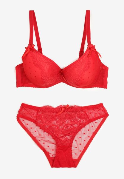 Czerwony Komplet z Koronki Majtki Typu Figi i Biustonosz z Kokardami i Usztywnieniem Arrbelia