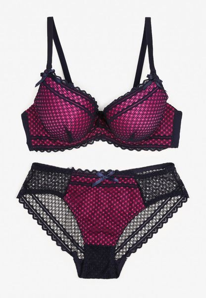 Granatowo-Fuksjowy Komplet z Koronki Regulowany Biustonosz Full Cup oraz Majtki Figi Irialynne