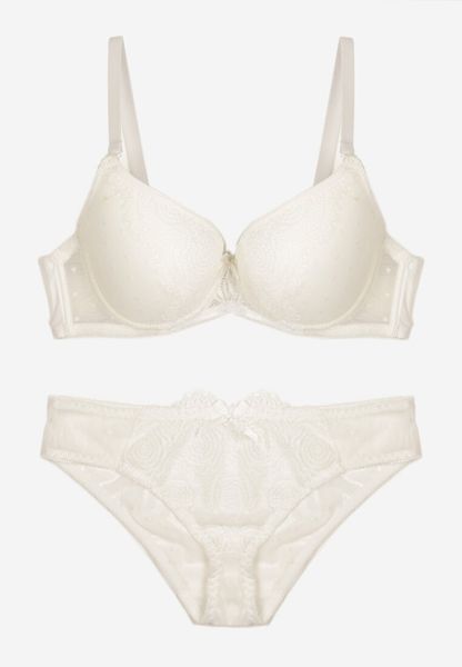 Jasnobeżowy Komplet z Koronką Figi i Usztywniany Biustonosz z Kokardami Iridorea