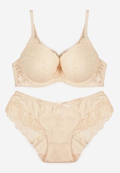 Jasnobeżowy Koronkowy Komplet Majtki Figi i Biustonosz Eziselle