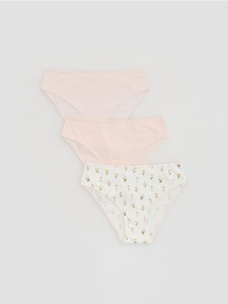 Majtki typu figi, wykonane ze wzorzystej, bawełnianej dzianiny.
