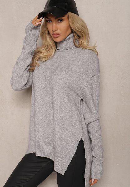 Szary Asymetryczny Golf o Klasycznym Kroju z Długim Rękawem Serattia
