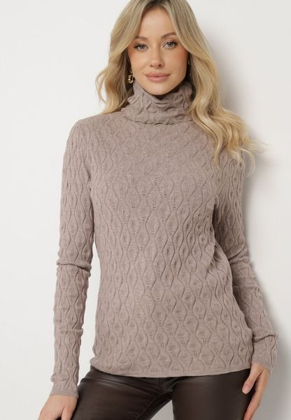 Ciemnobeżowy Golf z Wiskozą Zdobiony Tłoczonym Wzorem i Metaliczną Nicią Ilamirael