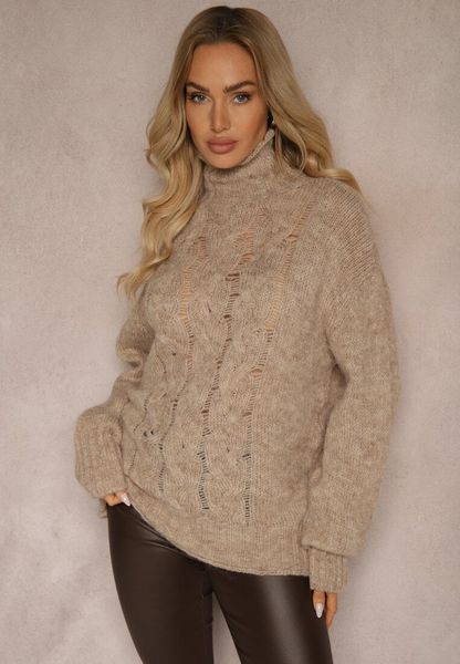 Brązowy Golf Wełniany z Warkoczykowym Splotem Emunsja