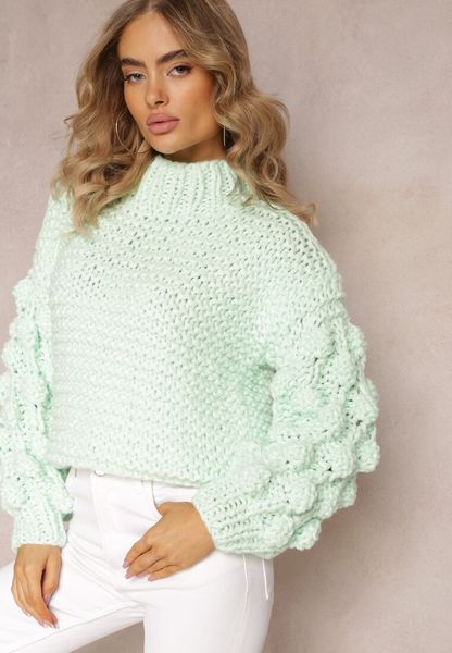 Miętowy Klasyczny Golf z Ozdobnym Splotem na Rękawach Biska