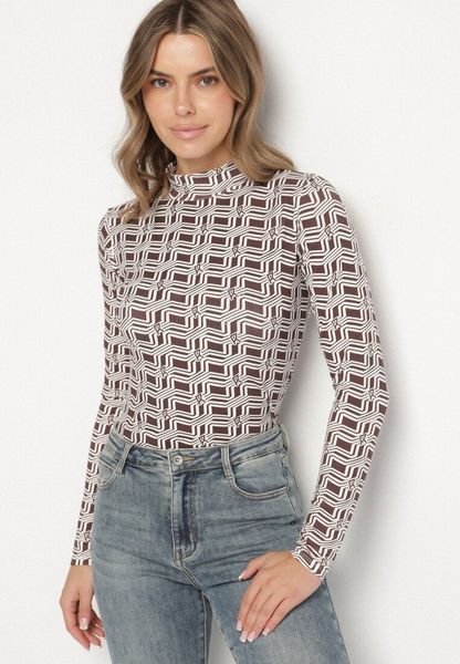 Biało-Brązowa Bawełniana Bluzka z Golfem i Długim Rękawem w Geometryczny Wzór Vilitila