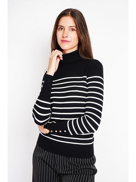 – kołnierz: golf- detale: ozdobne guziki- krój: prosty- wzór: paskiWskazówka: Na metkach odzieży tej marki znajdują się rozmiary francuskie. Rozmiarówka została przez nas przeliczona. Podane do wyboru warianty rozmiarów odpowiadają standardowym europejskim rozmiarom konfekcji. Prosimy zapoznać się z zamieszczonym objaśnieniem rozmiarów.