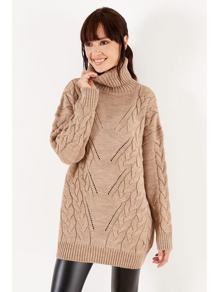 – z dodatkiem wełny- kołnierz: golf- krój rękawów: nietoperz- ściągacz: kołnierz, zakończenia rękawów, dolny brzeg- wzór splotu: warkocz- krój: oversized- look: jednokolorowyUwaga: Przy wyborze właściwego wariantu zaleca się korzystanie z tabeli rozmiarów.