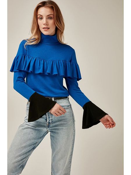 – kołnierz: golf- krój rękawów: rozszerzany do dołu- detale: falbany- krój: prosty- wzór: colour blockingUwaga: Przy wyborze właściwego wariantu zaleca się korzystanie z tabeli rozmiarów.