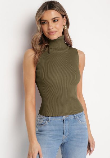 Zielona Khaki Bluzka z Golfem bez Rękawów z Elastycznego Materiału Heliordia