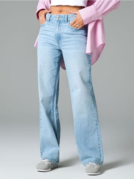 Sinsay – Jeansy wide leg – turkusowy – wysoki stan,szlufki do paska,efekt sprania,zapięcie na suwak i guzik,100% bawełna