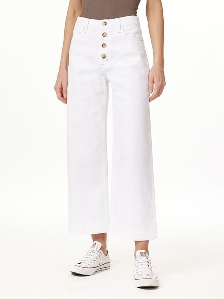 – wysokość pasa: high waist- fason: comfort fit- krój nogawek: szeroki- zapięcie: listwa guzikowa- szlufki na pasek: tak- kieszenie: wpuszczane i tylne- długość nogawki: 7/8- look: jednokolorowy