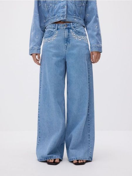 Jeansy o kroju wide leg, wykonane z bawełnianej tkaniny.