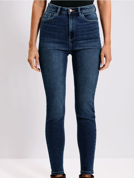 Sinsay – Jeansy super skinny high waist – granatowy – zapięcie na suwak i guzik,wszyte szlufki na pasek,2 kieszenie z przodu i z tyłu,wysoki stan,długie, dopasowane nogawki