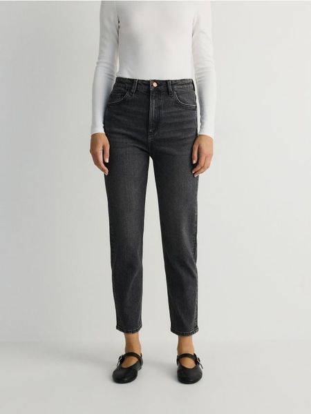 Jeansy o kroju mom fit, wykonane z bawełnianej tkaniny.