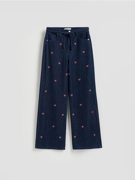 Jeansy o kroju wide leg, wykonane z bawełnianej tkaniny.