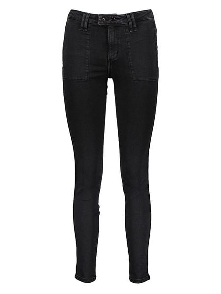 – wysokość pasa: regular waist- fason: skinny fit- krój nogawek: wąski- szlufki na pasek: tak- zapięcie: guzik i suwak- kieszenie: wpuszczane i tylne- naszywki: skórzane- przetarcia: tak