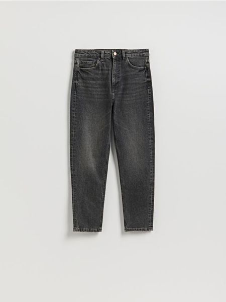 Jeansy o kroju mom fit, wykonane z bawełnianej tkaniny.