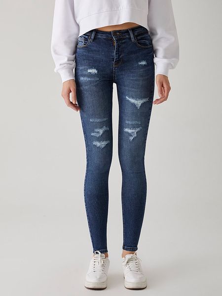 – wysokość pasa: high waist- fason: skinny fit- krój nogawek: wąski- szlufki na pasek: tak- zapięcie: guzik i suwak- kieszenie: 5 klasycznych- naszywki: ze skóry syntetycznej- przetarcia: tak- look: used