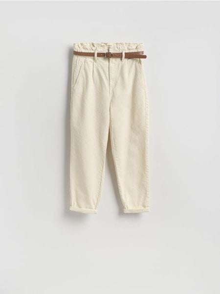 Jeansy o kroju paperbag, wykonane z bawełnianej tkaniny.