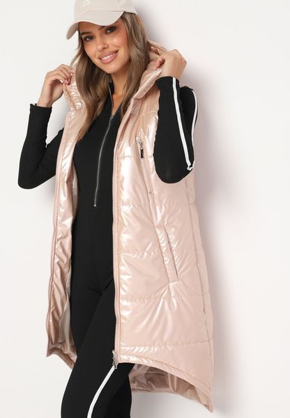 Beżowa Długa Kamizelka z Kapturem Ozdobiona Imitacją Kieszeni Mavaria