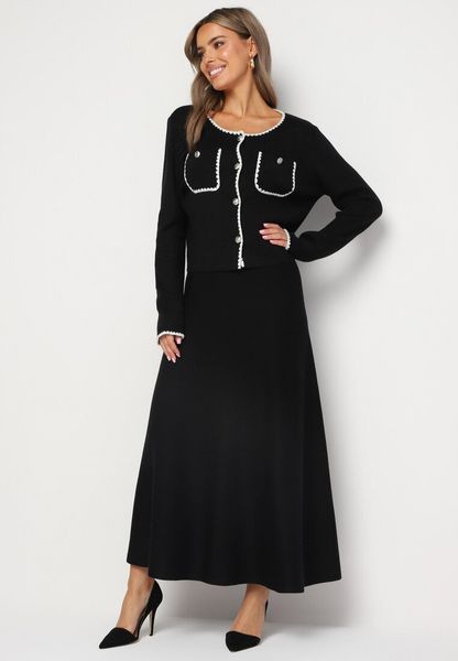 Czarny Komplet z Wiskozy Kardigan na Guziki i Rozkloszowana Spódnica z Gumką w Pasie Verivian